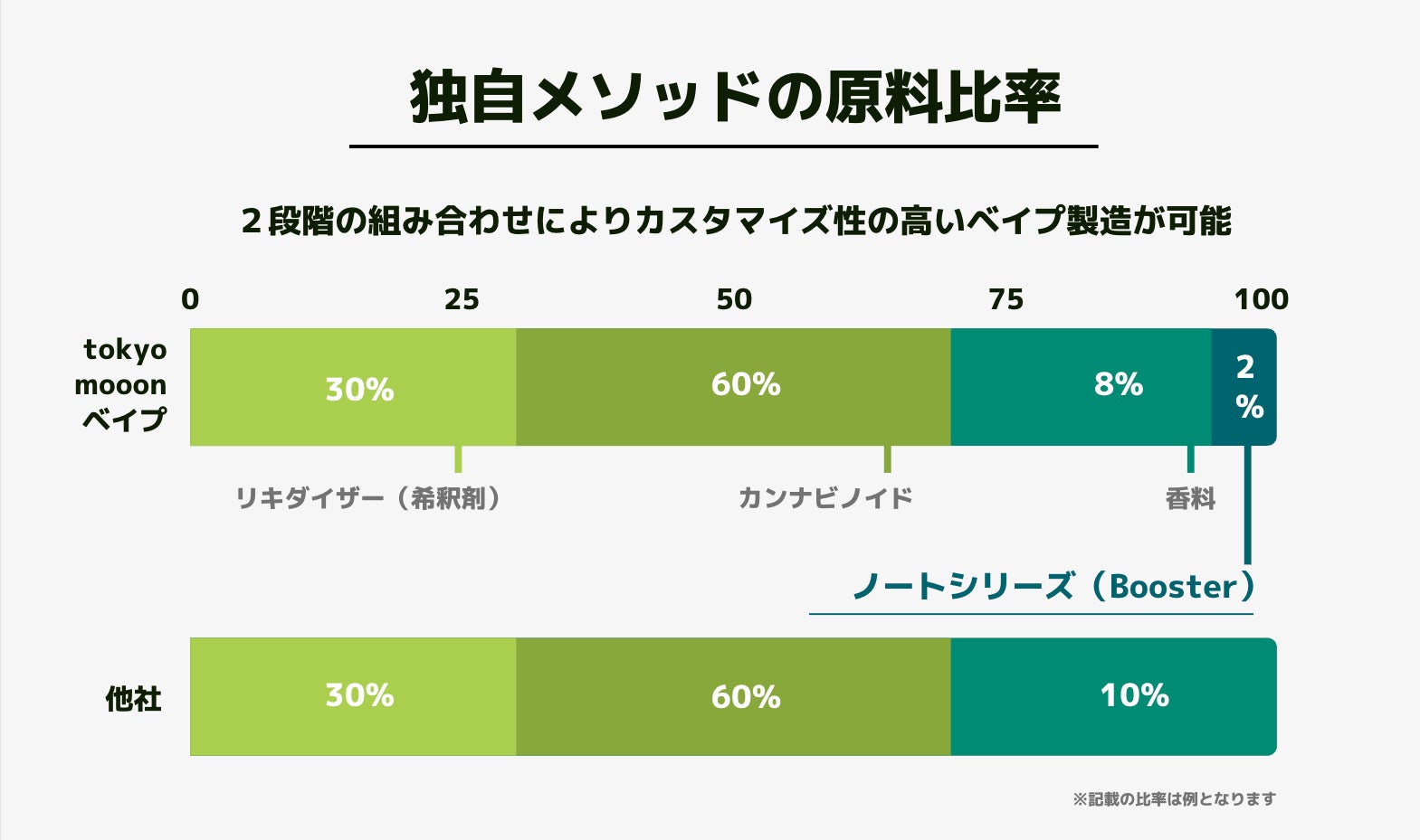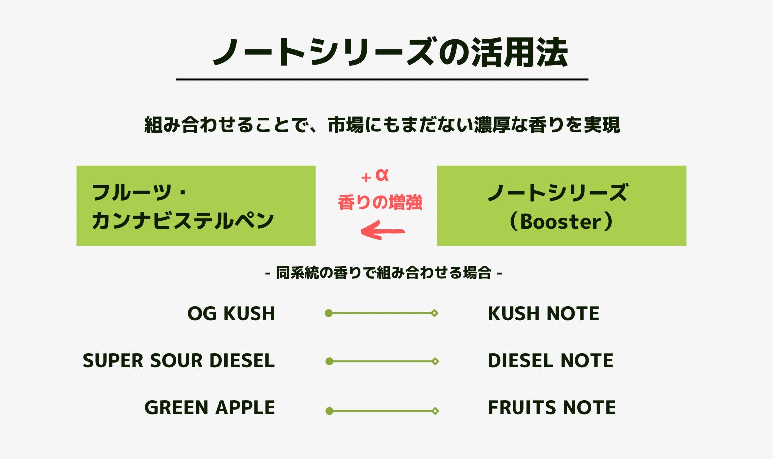 tokyo mooon独自で提案する手法は、テルペンに相性の良い「ノートシリーズ(Booster)」を組み合わせ、味を増強、または拡張することでテルペン本来の持つ魅力を更に引き出す手法です。