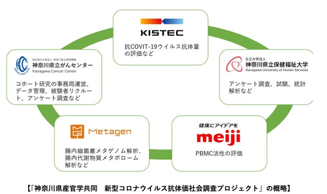 地方独立行政法人 神奈川県立産業技術総合研究所(以下、KISTEC)が中心となって、公立大学法人 神奈川県立保健福祉大学、地方独立行政法人 神奈川県立病院機構神奈川県立がんセンター、株式会社 メタジェンと進めている新型コロナウイルス抗体保有者の生活習慣や腸内環境の調査に関する共同研究に、乳酸菌をはじめとする微生物が腸内環境や免疫機能にもたらす影響についての知見を有する株式会社 明治(代表取締役社長:松田 克也、以下、明治)が参画し、産官学連携による共同研究として「神奈川県 産官学共同 新型コロナウイルス抗体価社会調査プロジェクト」がスタートします。