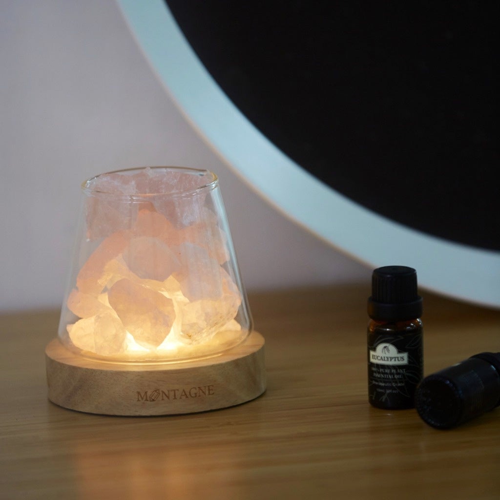 インテリアとしてもおしゃれな、ピンククリスタルのディフューザー、アロマオイル、ベースライトのセット。火を使わないので、ベッドサイドに置いても安心。やさしい光にも癒されそう。