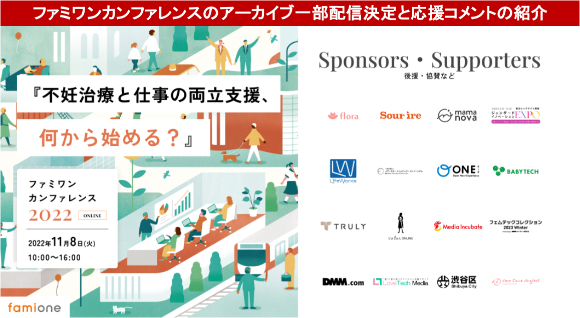 この度、ファミワンカンファレンスの企画を進める中で、多数の要望をいただいた当日の動画のアーカイブ配信と、数多くの企業さまから後援・協賛をいただいた応援コメントを公表させていただきます。