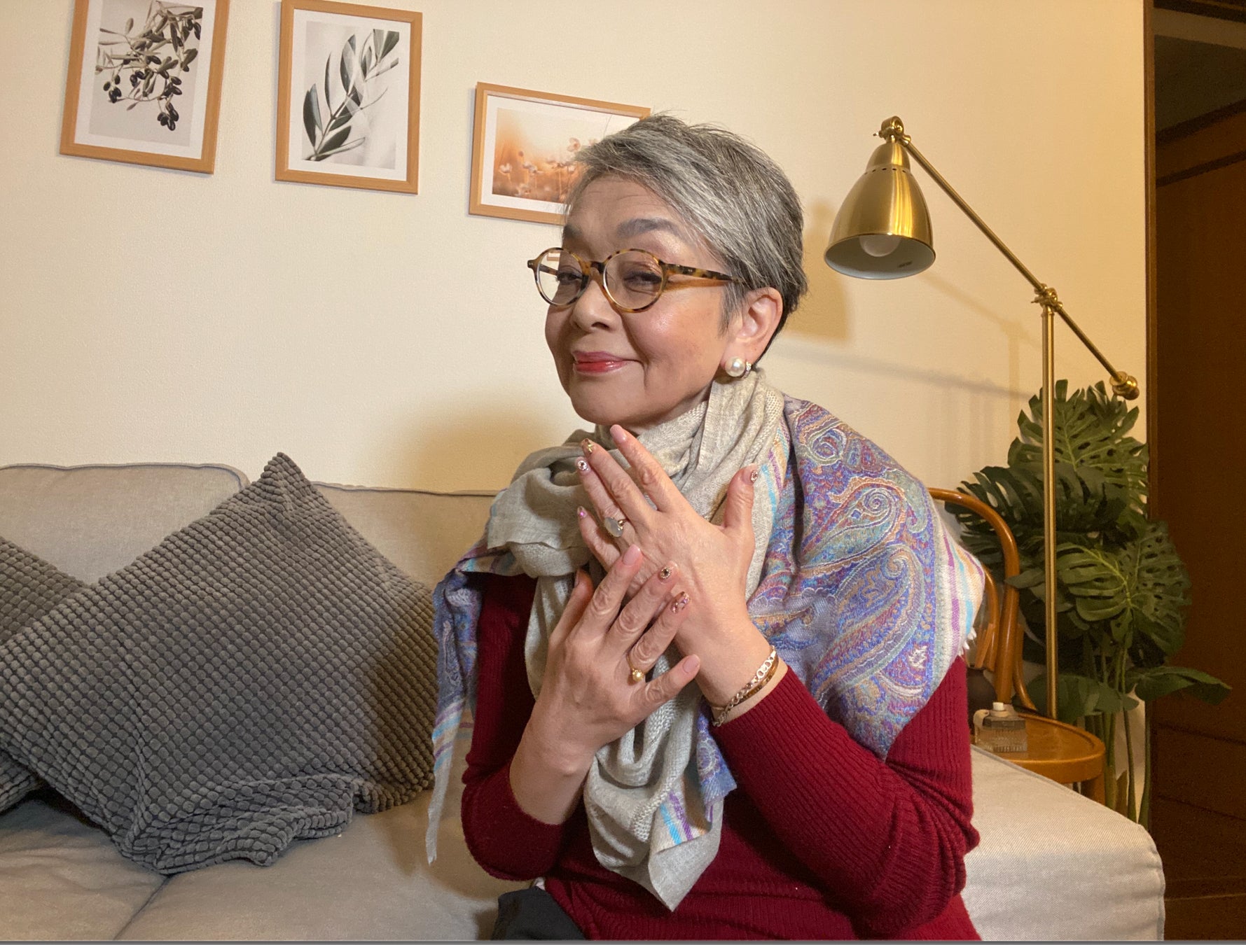 グレーヘアのおばあちゃんならではのファッション小物選びが今は楽しい。トレンドのアイテムにもトライして、自分らしいシニアの着こなしを探すのを楽しんでいます。