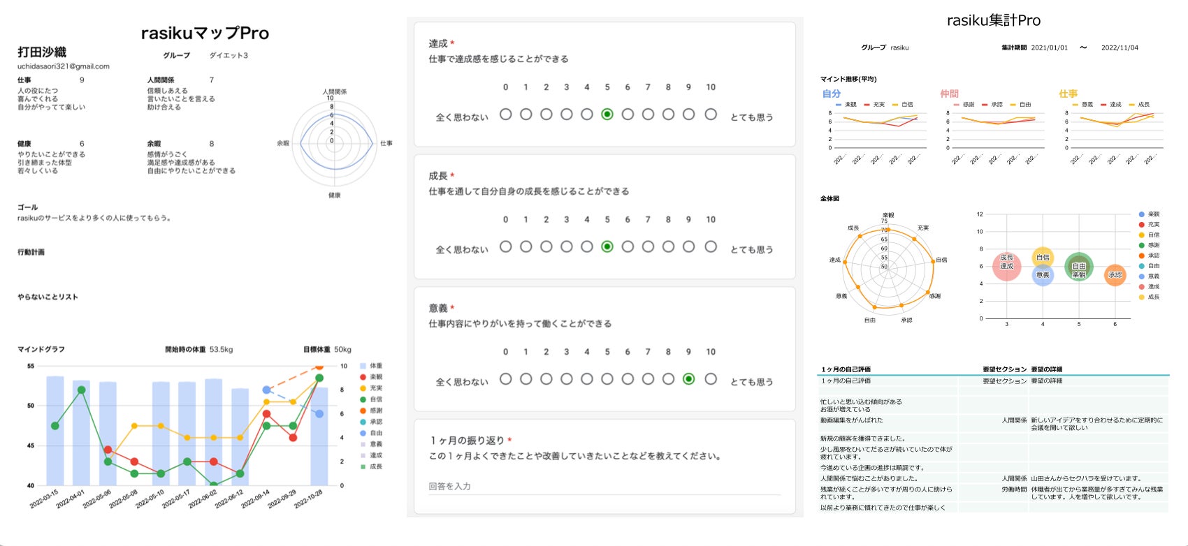 大切な社員のマインドに目を向けるのにハードルを上げていませんか?システム導入不要、初期コスト不要で看護師が全面サポートするウェルビーイング経営をすぐに実現。すでにセキュアな運用が実現している「メールアドレス」をIDに活用。汎用性の高いGoogleフォームとクラウドデータベースからマインドや体調を収集、分析しグラフ化した「rasikuマップ」を提供。さらにアンケート形式で会社への要望やオリジナルの質問も可能です。入力を促すメールは社内メルマガのように社員の健康を維持するツールとしても活用できます。