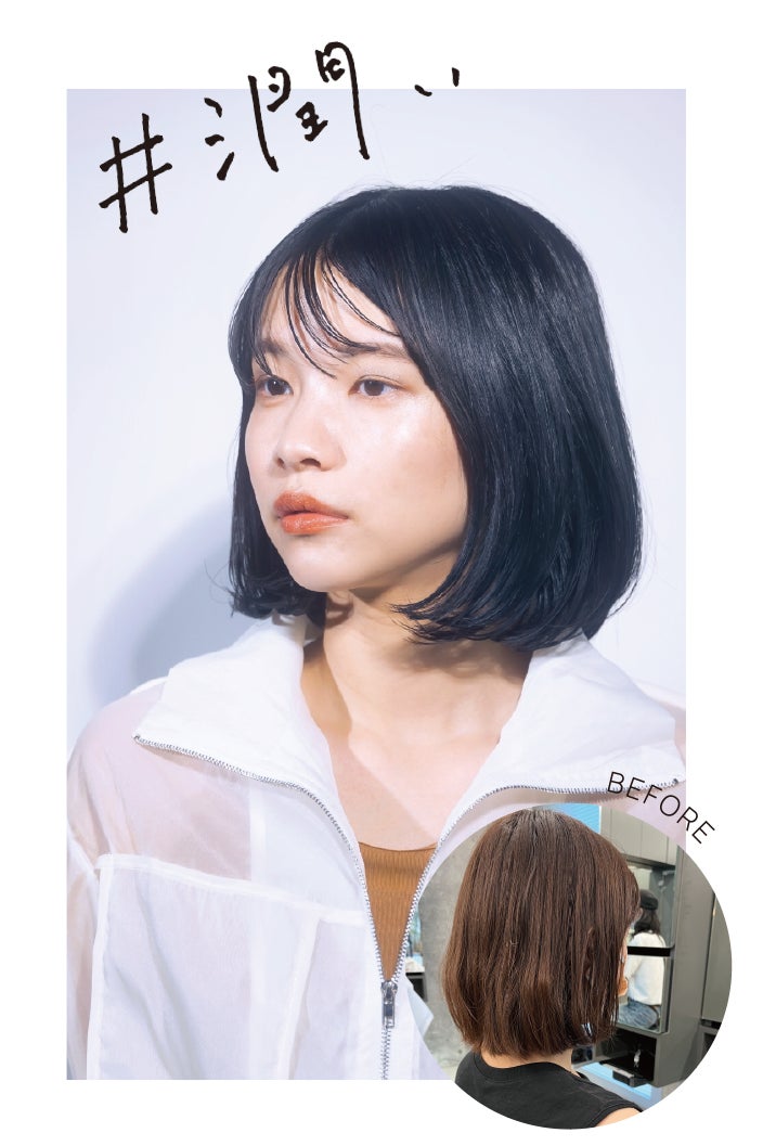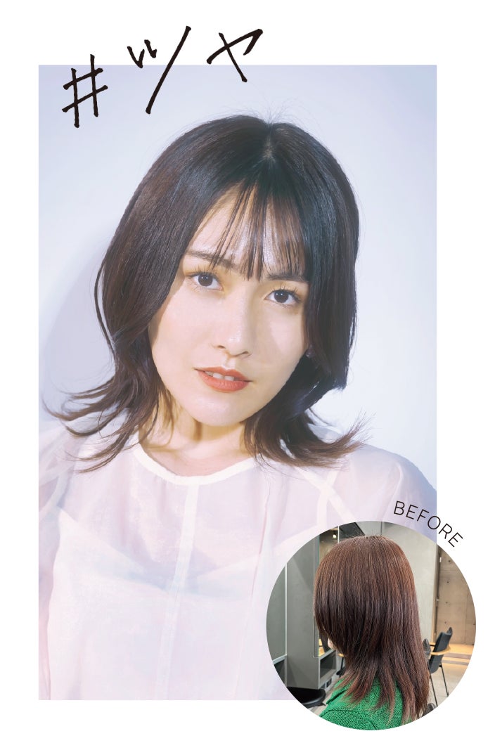 ダメージを受け弱くなった髪の強度が上がりまとまりが出るので、カットの際もイメージ通りのスタイルが作りやすくありがたいです。髪が潤うことにより「しっとり・ツヤ」がでて更に柔らかい髪になるのがポイントです。
