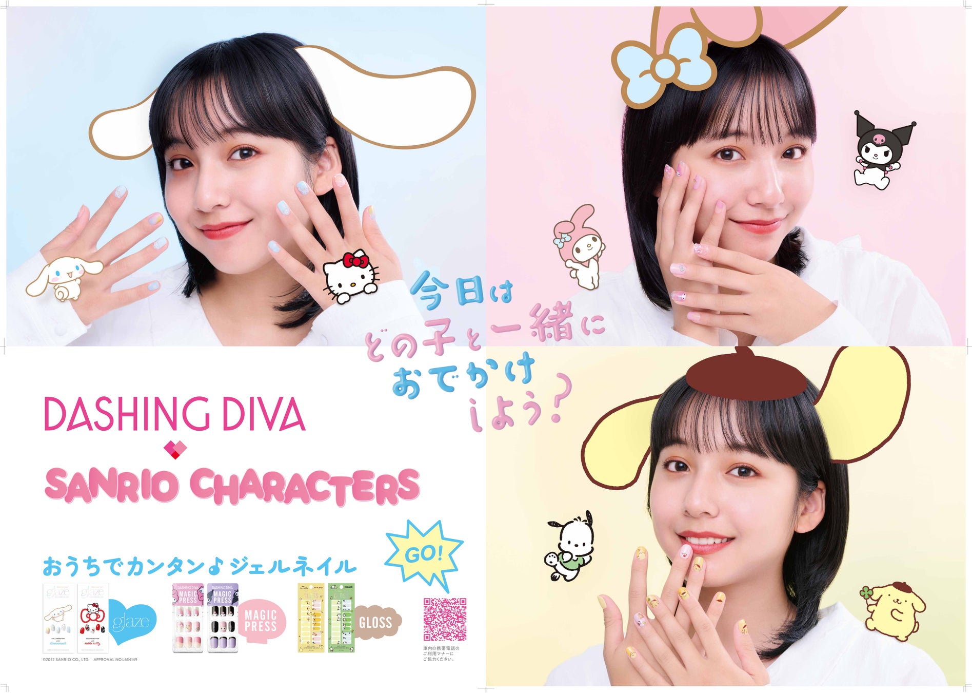 「今日はどの子と一緒におでかけしよう?」というコピーのもと、おでかけ前に6キャラクターから選んで、自宅で簡単に自分のファッションの一部にできるジェルネイルをビジュアル化するために「glaze」はシナモロール、「MAGIC PRESS」はマイメロディ、「GLOSS」はポムポムプリンと、商品に合わせて山之内さんとキャクターが一緒にいる?表現にいたしました。是非、皆さんもお気に入りのキャラクターと一緒におでかけを楽しんでください。