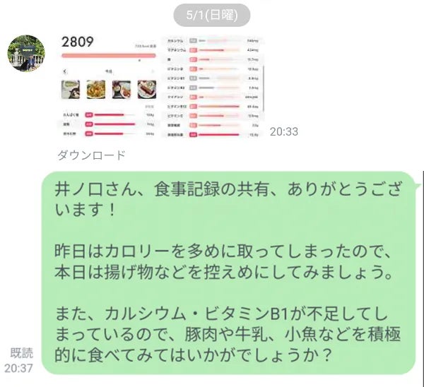 LINEで1日の食事を送信すると専門トレーナーからアドバイスが送られます。