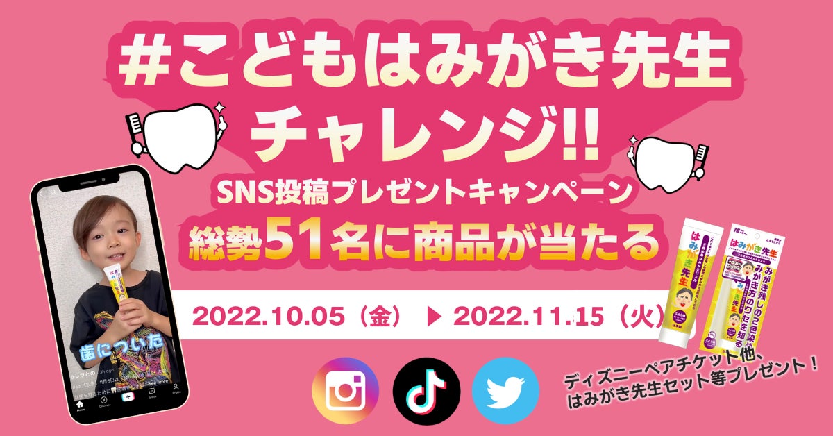 キャンペーンページに記載された「正しいはみがきの台本」の中から一つを選んで「#こどもはみがき先生」をつけてTiktok・instagram・Twitter動画投稿して頂くキャンペーンです。