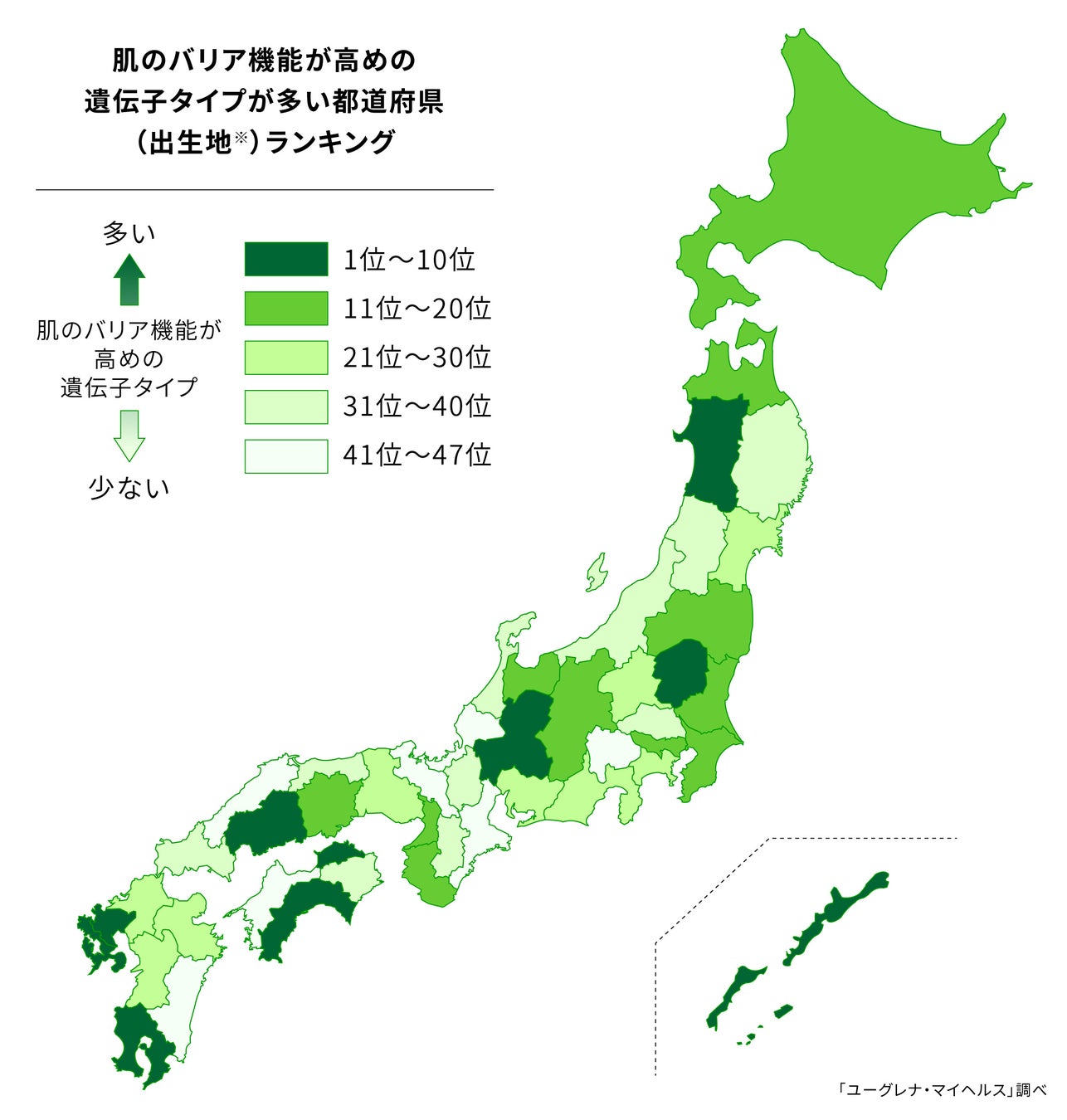 株式会社ユーグレナ(本社:東京都港区、代表取締役社長:出雲充)は、ユーグレナ・マイヘルスとジーンクエストの遺伝子解析サービスのゲノムデータをもとにした、「肌のバリア機能が高めの遺伝子タイプが多い都道府県(出生地※)ランキング」を公開いたします。