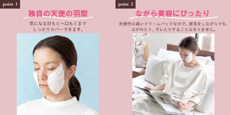 独自の天使の羽型シートが、気になる目もと口もとをしっかりカバー。こだわりの保湿成分と特殊な2層構造のクリームシートがお肌のうるおいを守り、乾燥による小じわを目立たなくします。*効能評価試験済み