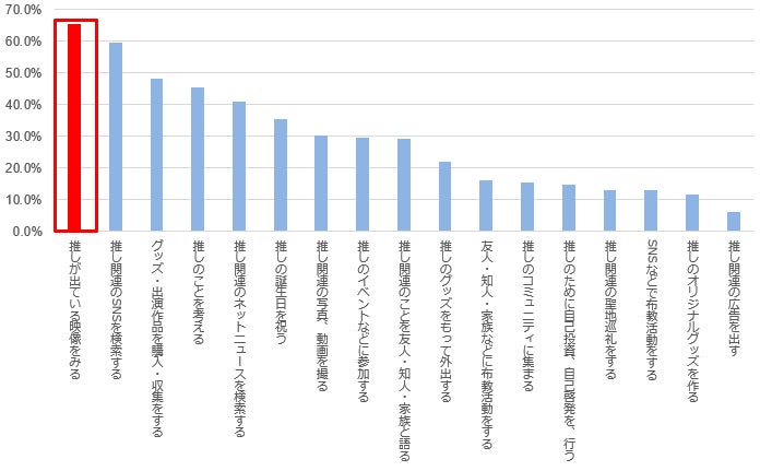 推している存在がいる。かつ、推し活をしている方の内、全体の6割以上は「推しの映像をみる」推し活をしているという結果になりました。推しを応援するのと同時に、推しの映像をみることでご自身を癒している方が多いことが推察されます。その他では、「情報収集」「グッズ収集」の傾向があり、推しに関する理解・把握、新しいものを収集する活動をされていることが判明しました。