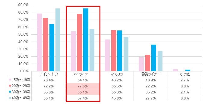 「推し活メイク」のアイメイク方法としてアイシャドウ・アイライナーを取り入れる方が、最も多い結果となりました。年代別で見ると、20・30代は「アイライナー」の回答者がアイシャドウに比べ多い結果となり年代別での傾向差が出ました。