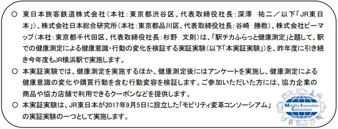 〇 東日本旅客鉄道株式会社、株式会社日本総合研究所、株式会社ビーマップは、「駅チカふらっと健康測定」と題して、駅での健康測定による健康意識・行動の変化を検証する実証実験を、昨年度に引き続き今年度もJR横浜駅で実施します。