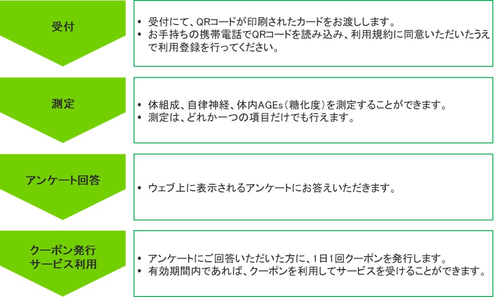 〇 本実証実験では、健康測定を実施するほか、健康測定後にはアンケートを実施し、健康測定による健康意識の変化や購買行動を含む行動変容を検証します。ご参加いただいた方には、協力企業の商品や協力店舗で利用できるクーポンなどを提供します。