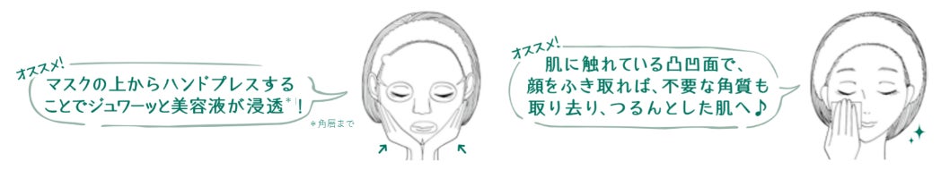 コットン生まれでやわらかな肌あたりの国産シート ベンリーゼ®を使用。シートマスクの表面には凸凹の加工を施しており、密着性が高く、はがしたマスクで顔をふきとることで角質ケアもできます。