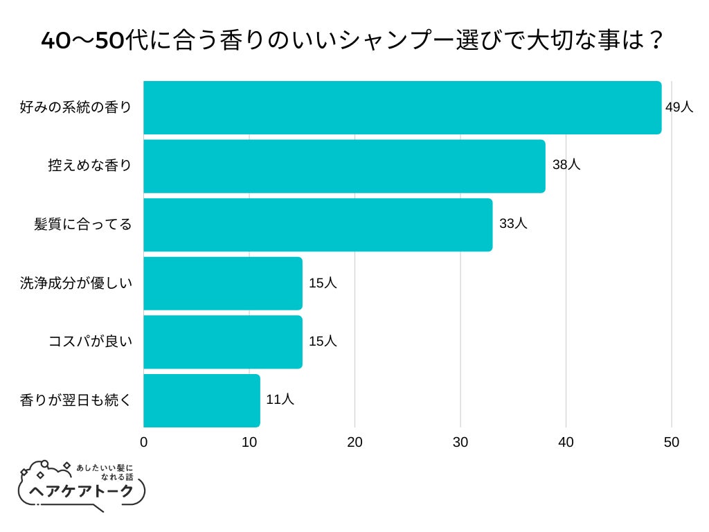 「40~50代に合う香りのいいシャンプー選びで大切な事は?」とアンケート調査した結果、1位は『好みの系統の香り』でした。