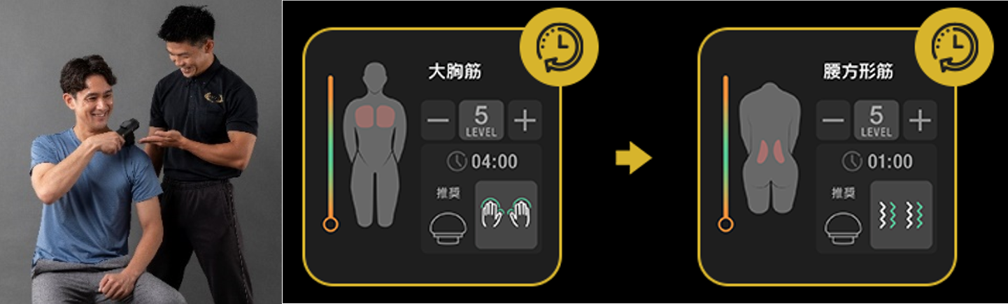 【ダブルヘッドガン】単体の使用だけでなく、『ライザップ』とのコラボ第一弾製品であるエクササイズマシン【3Dバランスブレード】でのトレーニング前後に使用することで、より運動効果を高めることも可能です。