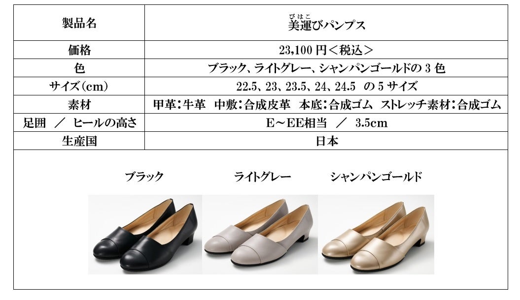 株式会社ファンケルは11月11日(金)から、「美運びパンプス(びはこび)パンプス」(価格:23,100円<税込>/全3色・5サイズ)を通信販売および一部店舗にて数量限定で発売します。