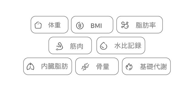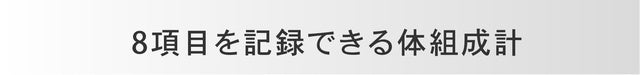 WeighMatsの体組成計は、体重、BMI、体脂肪率、筋肉量、体水分率、内臓脂肪、骨量、基礎代謝の計8項目に対応しています。