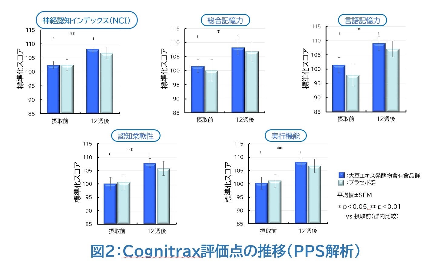 PPS解析の結果、群間比較による統計的有意差は確認されませんでしたが、大豆エキス発酵物含有食品群にのみ「神経認知インデックス(NCI)」、「総合記憶力」、「言語記憶力」、「認知柔軟性」、「実行機能」の認知領域において摂取前と比べて摂取12週後のスコアが上昇し、群内比較による有意な改善効果が確認されました(図2)。