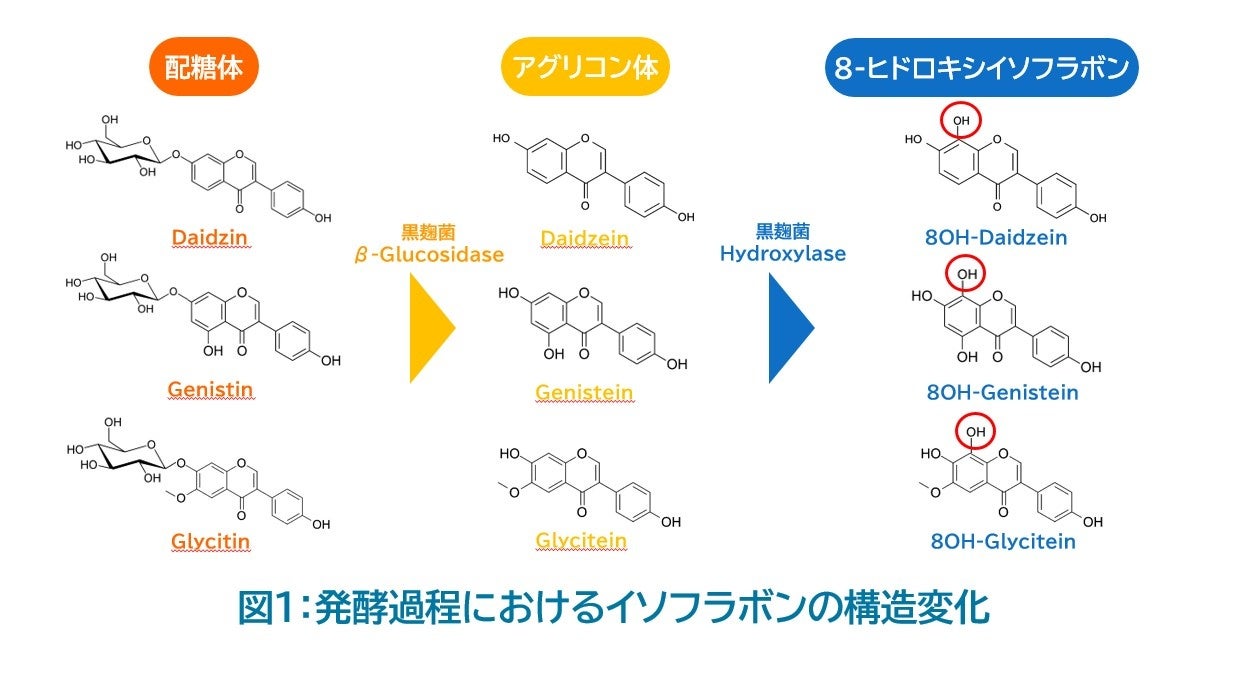 大豆エキスを麹菌で発酵させた大豆エキス発酵物は、有効成分「8-ヒドロキシイソフラボン類」が含まれ、抗糖化・抗酸化作用の機能性を持った食品原料です。