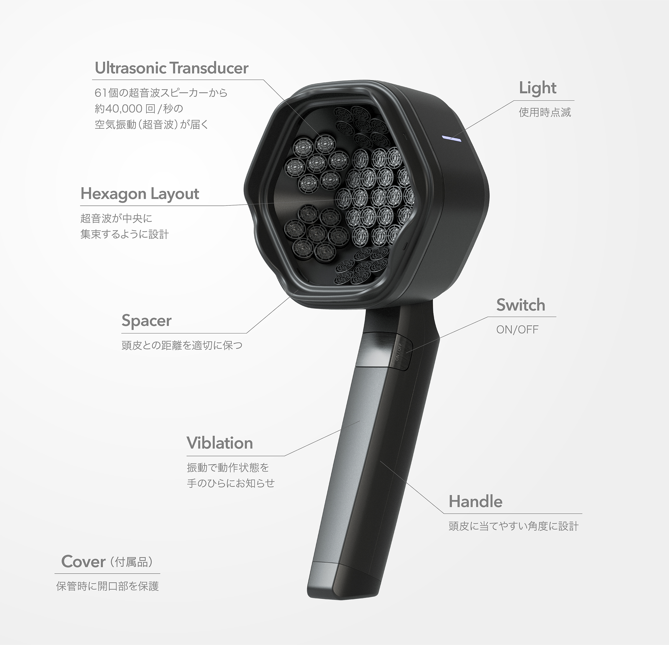 続いて、ピクシーダストテクノロジーズの星氏が登壇し、今回の「SonoRepro™」について発表しました。 「家庭用に活用するにはどのようにすればよいのか、“軽さ・使いやすさ・デザイン性”を実現するべくエンジニアやデザイナーとともに奮闘した。もとになった大型デバイスは、超音波振動子を271個搭載しているが、今回の小型デバイスでは61個に減らし、照射距離も2cmに近づけ、片手で頭皮にあてられるように工夫した。