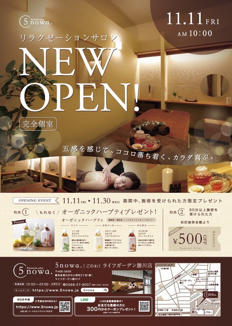 株式会社ジーアイビー(本社:名古屋市中区、代表取締役社長:鈴木 衛)は2022年11月11日(金) 10:00より、愛知県春日井市 ライフガーデン勝川店敷地内にリラクゼーションサロン「5nowa.」をOPENすることをお知らせいたします。