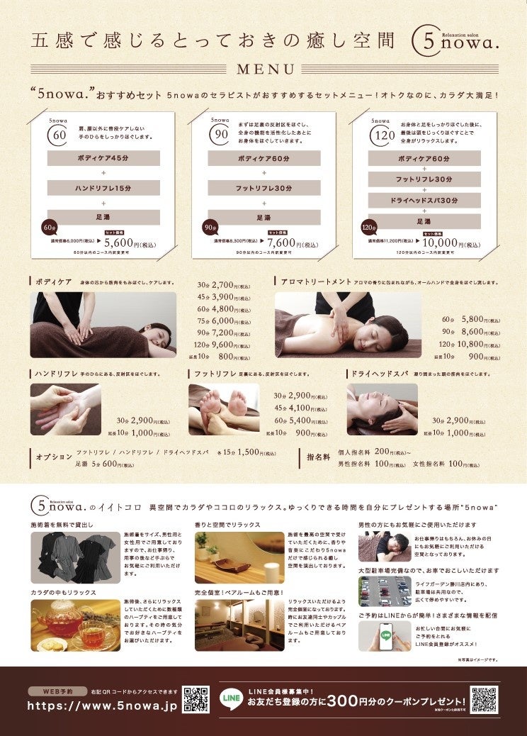 5nowa.では、五感を使って癒しを提供し、お疲れやストレスを“0(ゼロ)”にリセットすることをコンセプトにしています。