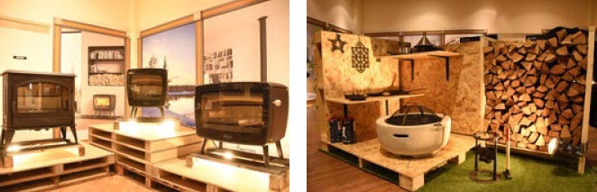 暖炉・薪ストーブエリアでは、 人気機種 11 台が勢ぞろい。実際に使用感を確認しながら、設置したときの 雰囲気を感じることができます。