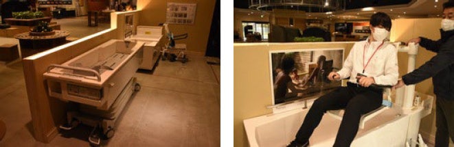 福祉エリアでは、 昇降機付き浴槽や寝浴用の浴槽を実際に操作し、操作方法や使い勝手を確認 しながらご検討いただけます。