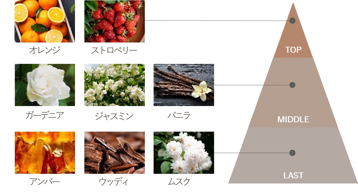 ウィンターシリーズに採用した「バニラムスクの香り」は、甘く温かみのある冬にぴったりの香りです。ガーデニア、ジャスミン、バニラ、アンバー、ウッディ、ムスクからなる濃厚なホワイトフローラルを基調に、オレンジ、ストロベリーをアクセントに加えました。