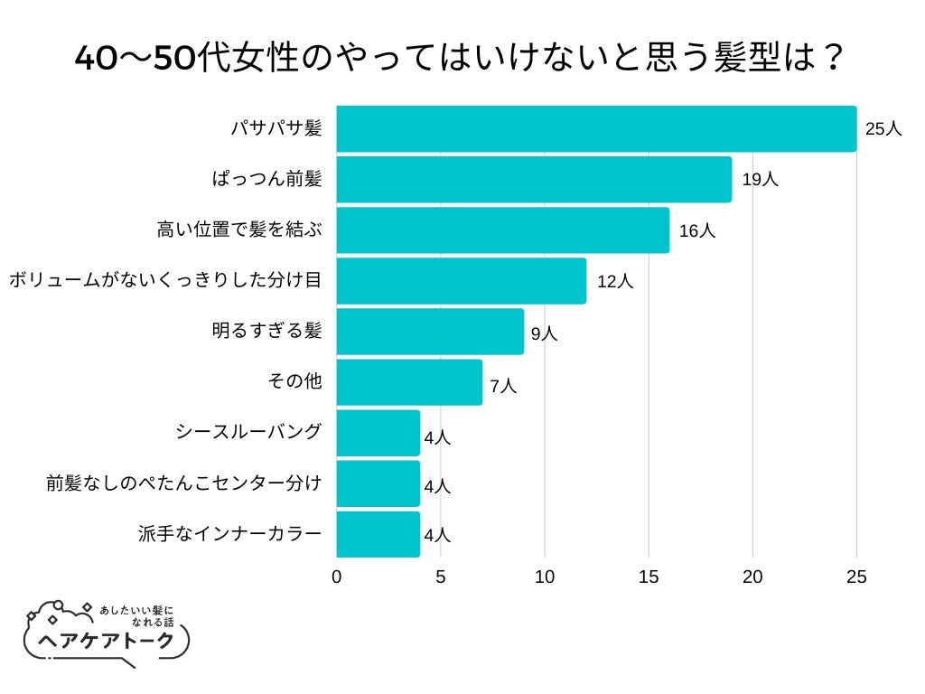 「40~50代女性のやってはいけないと思う髪型は?」とアンケート調査した結果、1位は『パサパサ髪』でした。