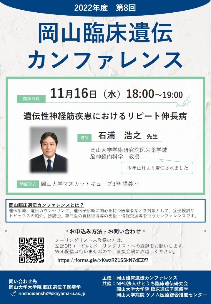 【岡山大学】2022年度「第8回岡山臨床遺伝カンファレンス」〔11/16水, 岡山大学鹿田キャンパス〕