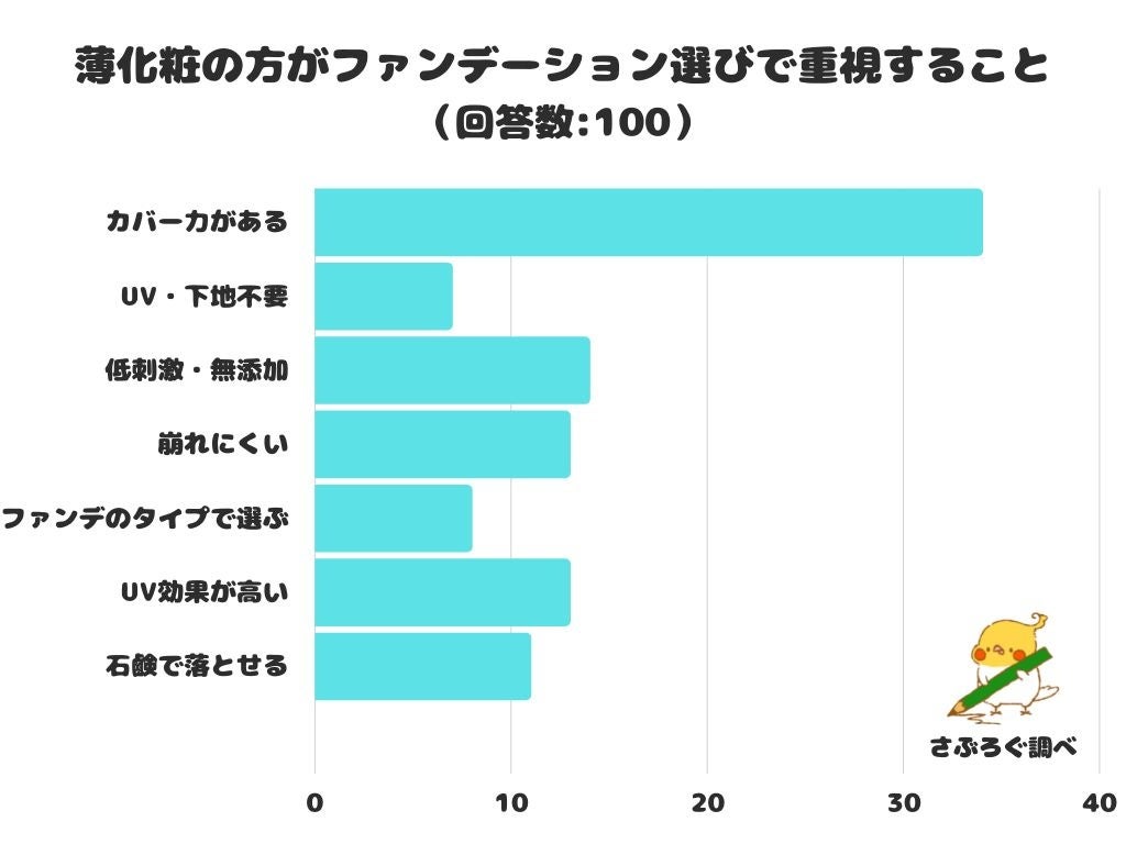 薄化粧の方がファンデーション選びで重視することをアンケートにて調査したところ、1位は「カバー力がある」でした。