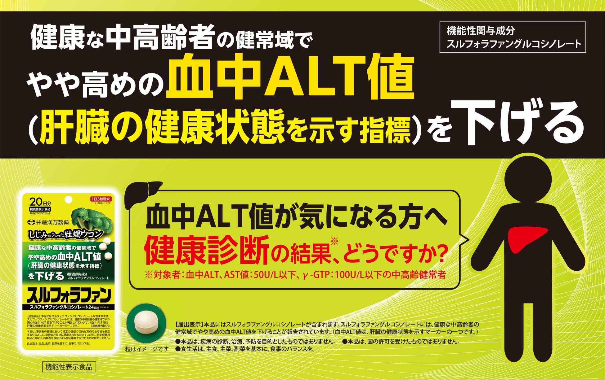 本品にはスルフォラファングルコシノレートが含まれます。スルフォラファングルコシノレートには、健康な中高齢者の健常域でやや高めの血中ALT値を下げることが報告されています。(血中ALT値は、肝臓の健康状態を示すマーカーの一つです。)