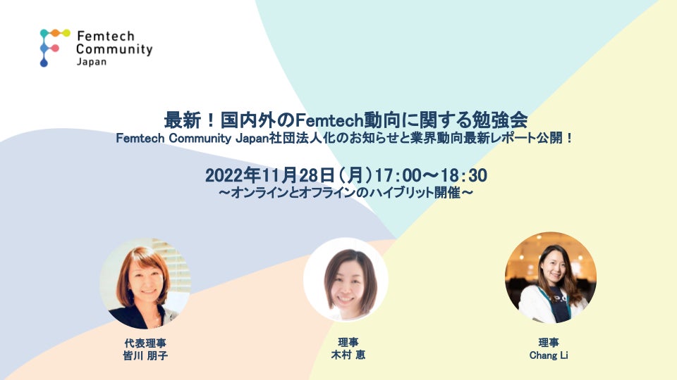 “Femtech関連のビジネス、プロダクト・サービス推進のために幅広く関係者がつながり、議論、情報共有、ネットワーキング、そして情報発信などを行うエコシステムの実現”を目指す、一般社団法人Femtech Community Japan(東京都渋谷区、代表理事 皆川朋子、以下Femtech Community Japan)は、11月28日(月)「最新!国内外のFemtech動向に関する勉強会」をオンライン・オフラインのハイブリッドで開催します。