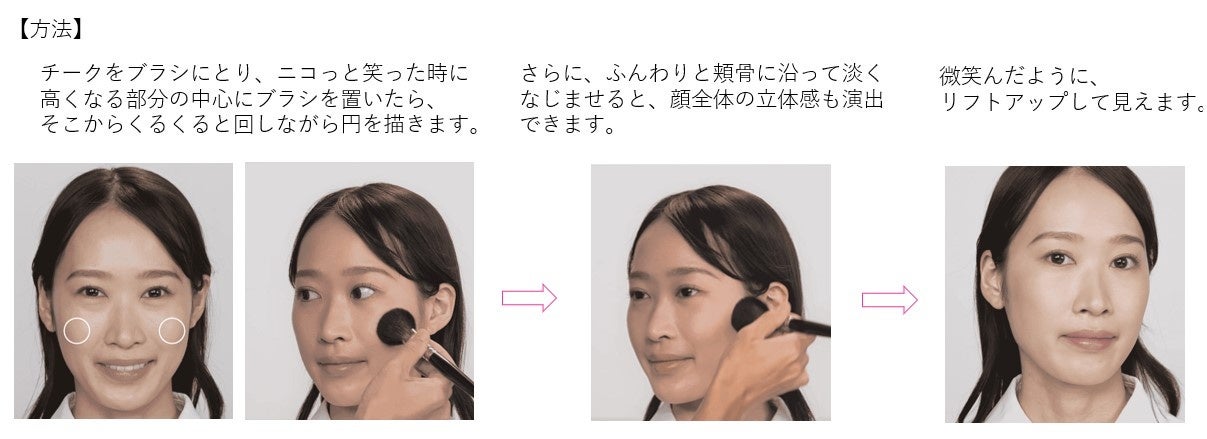 本年ポーラは、顔画像データから得られる空間周波数の強度と、幸福感の表れた顔の評価値との相関解析に基づいて、顔画像データから「幸福感の表れた顔」の度合いを高精度に評価する新規技術を開発※。その結果、頬や口回りの見た目の肌状態に関わる3つの要素が、年齢に関係なく、幸福感あふれる顔に必要であることがわかりました。『幸せメーク』は、この3要素を取り入れたメークです。