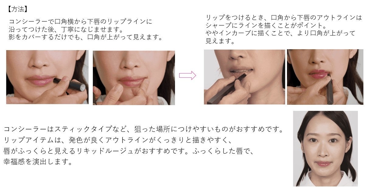 →コンシーラーで口角の影をカバーする。口角のリップラインをシャープに描く。