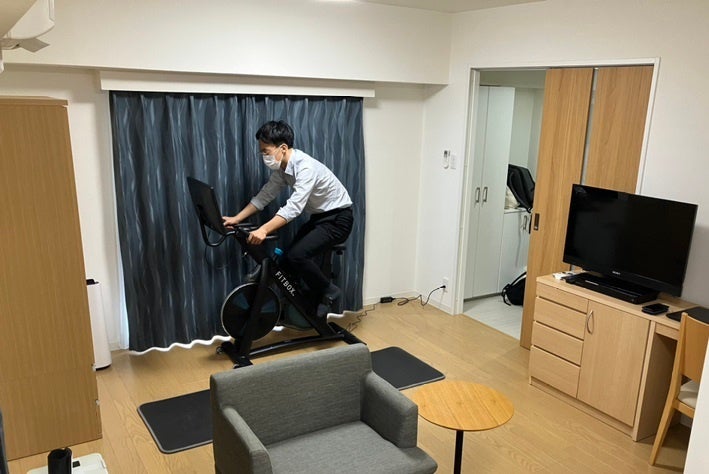 フィットネスバイク、ヨガマットの貸与とヘルシーなお弁当の提供により、運動と食事の面で健康的な生活を送ることができるようになっています。