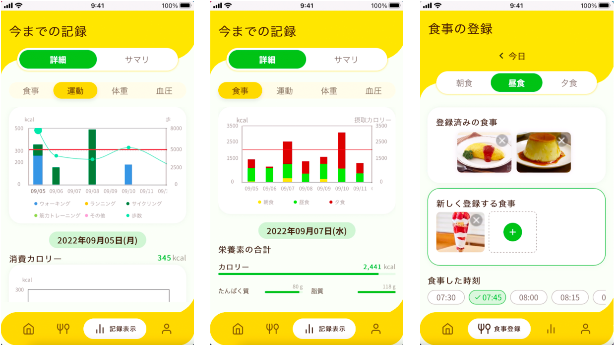 また、測定機器との連携によりデータを自動取得できるなど利用者の負担が軽減されており、特に食事は「カロミル」の画像解析技術を活用することで、写真を撮るだけで摂取カロリーがわかるようになっています。