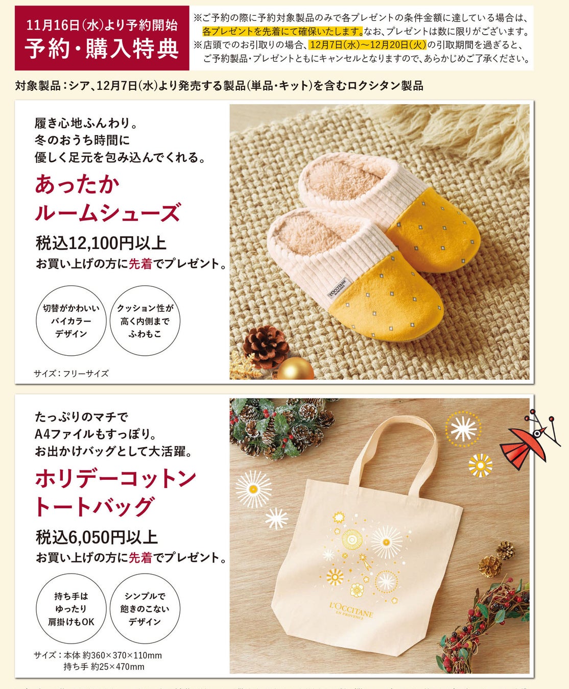 に「あったかルームシューズ」を、税込6,050円以上お買い上げの方には「ホリデーコットントートバッグ」を