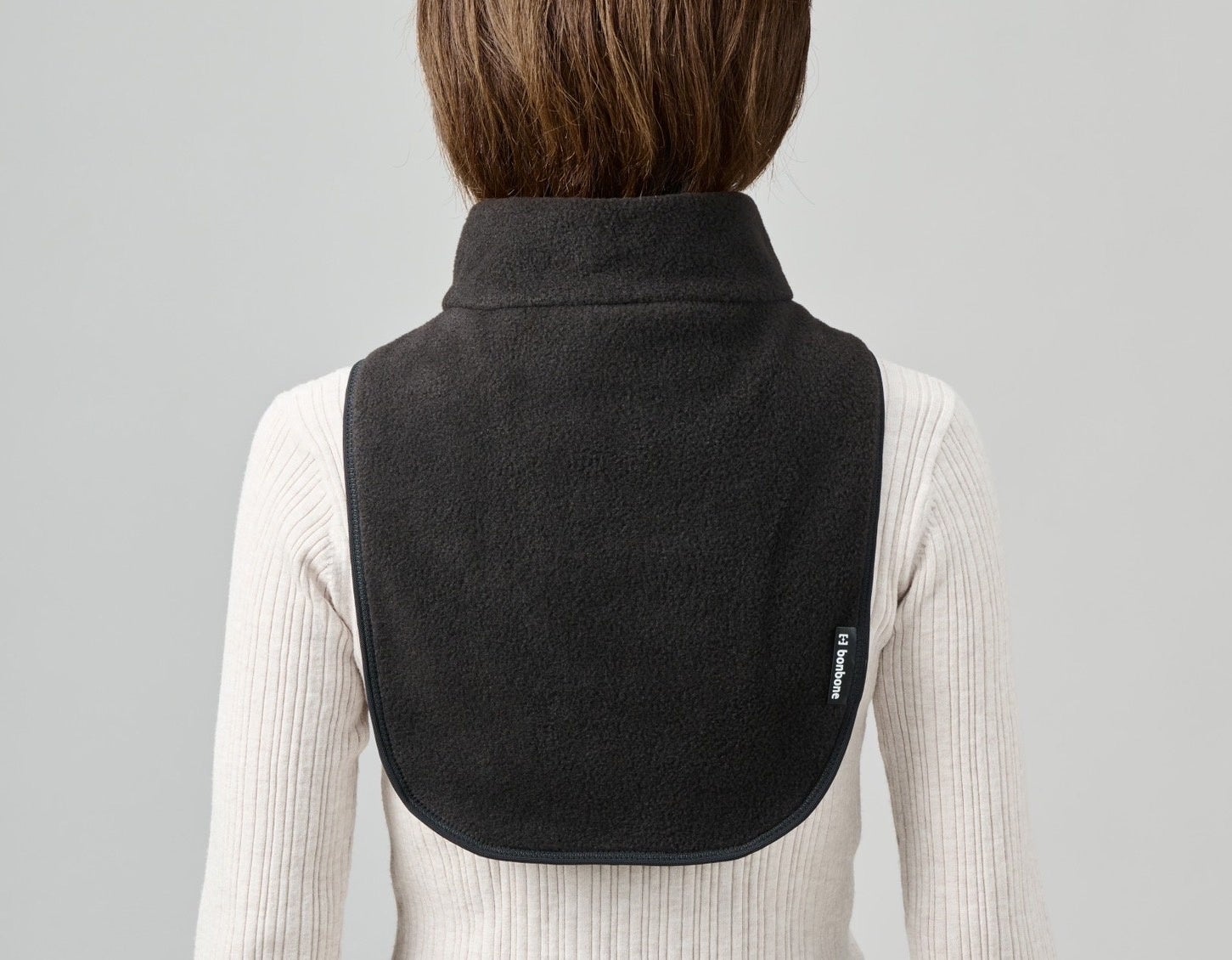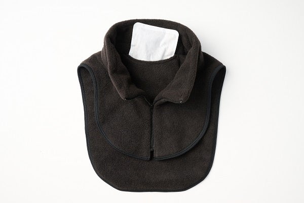 くび元から背中まで広く温め、寒さで縮こまった首と肩を優しいぬくもりで包みます。