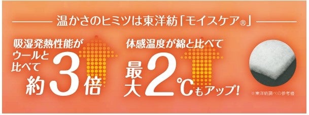 ウールと比べて約3倍も吸着発熱性能があり(※)、衣服内温度が綿に比べて最大2℃も高くなる保温性のある(※)素材「モイスケア(R)」を採用した発熱ウォーマーシリーズ。この度、数量限定で発熱ウォーマーくび用のロングタイプが登場しました。