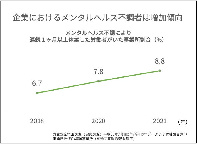 近年、健康経営に取り組む企業は年々増えており、健康経営を推進する施策も様々あります。メンタルヘルス対策では、ストレスチェックによる従業員の心の状態の調査や、従業員の心と体のケアをサポートするサービスなどを導入する企業は増加傾向にあります。しかし、近年コロナ禍におけるテレワークによる社内コミュニケーション不足等さまざまな要因により、メンタルヘルス不調となる従業員は増加傾向となっています。