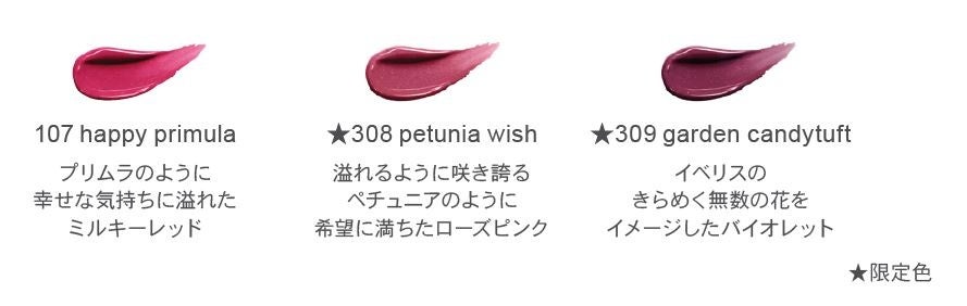 花々の繊細な彩りを表現したルージュ リップブロッサムから、人気の1色と限定の2色がセットになった特別なミニトリオ。ボタニカルワックス配合により、高い密着感、保湿効果や色もちのよさに加え、なめらかな塗り心地とクリアな発色、花蜜のような濃密なツヤ感を叶えます。