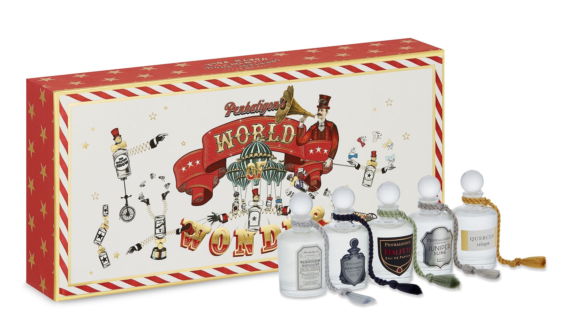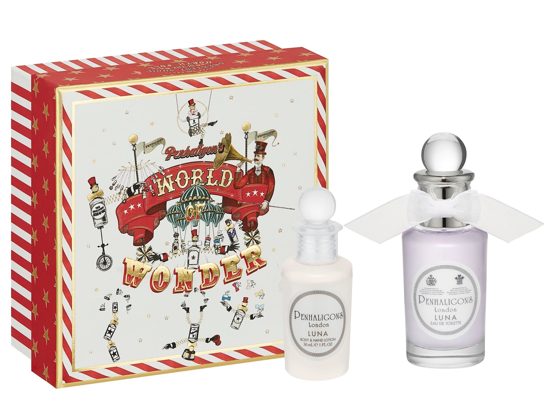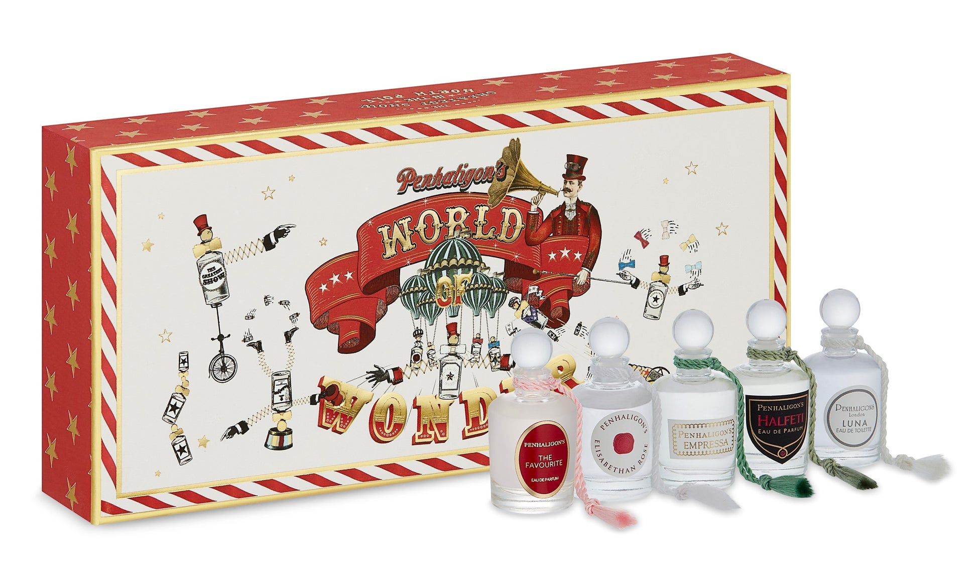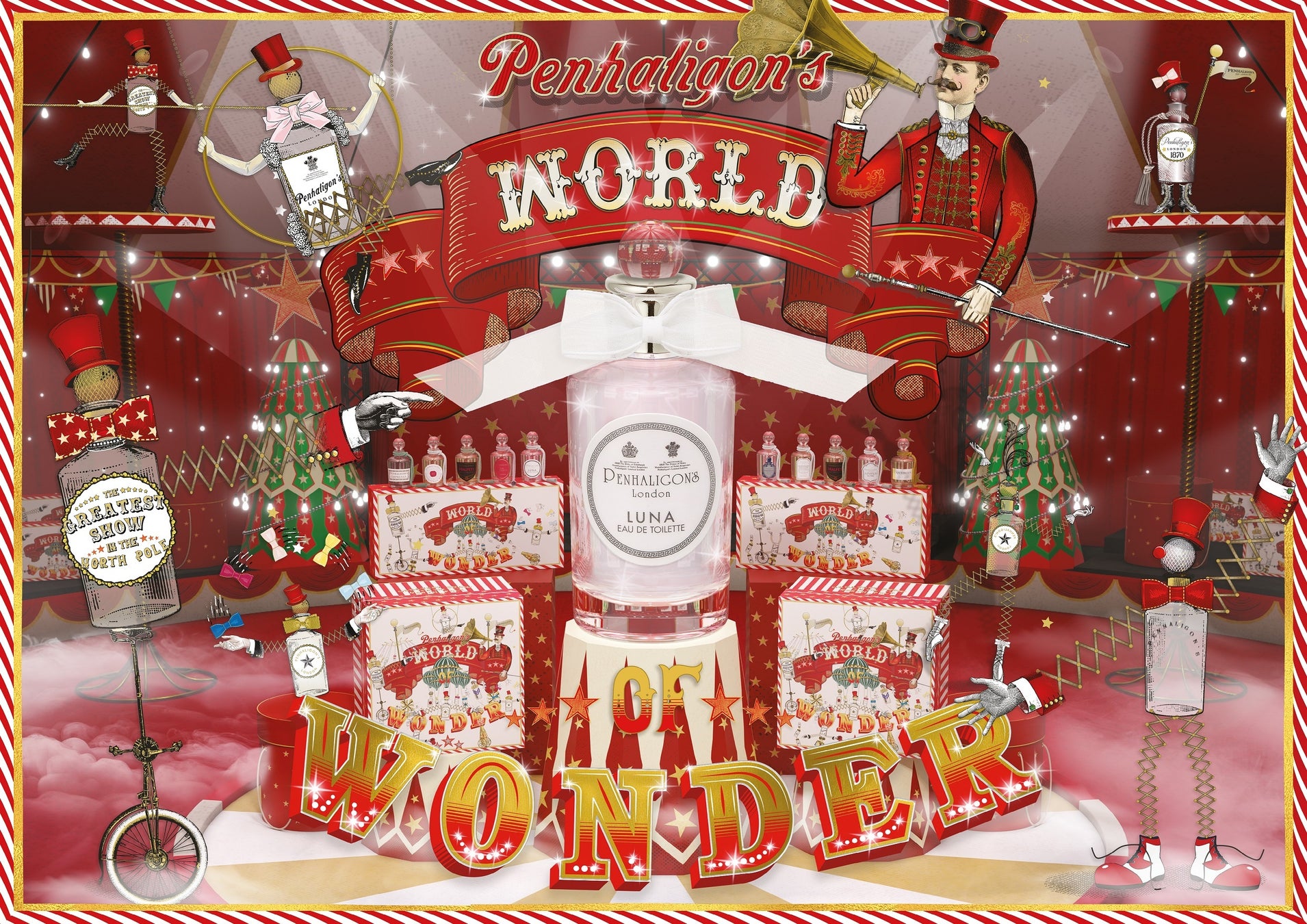 2022年のテーマは、‟World of Wonder(ペンハリガンが贈る移動遊園地「ワールド オブ ワンダー」)“。サーカスの大テントを彷彿させる赤と白のパターンが印象的な紙製ボックスに、人気の香りのミニチュアサイズと人気フレグランス「ルナ オードトワレ」をセットしました。フレグランスがパフォーマンスをするイラストを描いたワクワクするようなボックスを開けば、調香師が描いた魅力的なクリエイティブな世界が広がります。