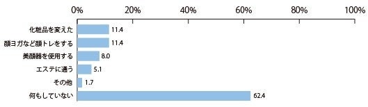 「化粧品を変えた」との回答が11.4%「顔ヨガなど顔トレをする」11.4%「美顔器を使用する」8.0%「エステに通う」5.1%。「何もしていない」との回答が62.4%と多くを占めました。「その他」には「丁寧な洗顔」「化粧水を使っている」「洗顔料使用と軽いマッサージ」「ダイエット」「ヒゲ脱毛」「脱毛器を買った」「角栓取り」「薬を塗る」といった回答がありました。