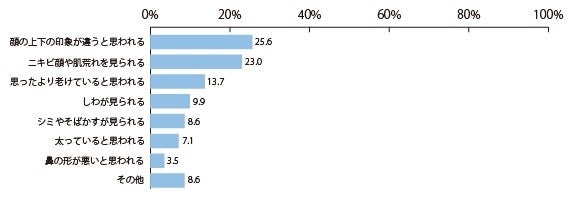 「顔の上下の印象が違うと思われる」25.6%「ニキビ顔や肌荒れを見られる」との回答者が23.0%「思ったより老けていると思われる」13.7%「しわが見られる」9.9%「シミやそばかすが見られる」8.6%「太っていると思われる」7.1%。「その他」には、「ヒゲ剃りあと」「ヒゲが濃い」などヒゲ関連の回答が多く、その他「乾燥」などの回答がありました。