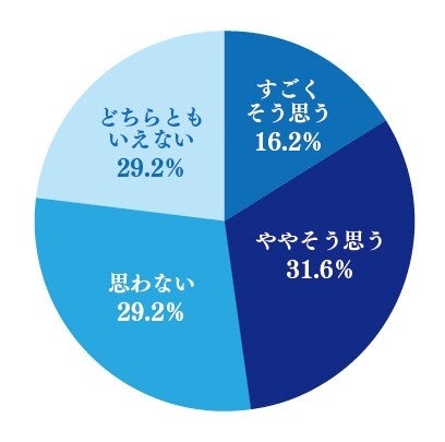 「すごくそう思う」との回答が16.2%「ややそう思う」が31.6%で合計47.8%(合計460名)。「思わない」との回答が29.2%(281名)「どちらとも言えない」23.0%(221名)。この項目については回答が割れました。