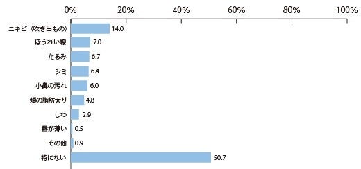 「ニキビ(吹き出もの)」14.0%「ほうれい線」7.0%「たるみ」6.7%「シミ」6.4%、「小鼻の汚れ」6.0%「頬の脂肪太り」4.8%などの回答がありました。「その他」には、「クマ」「皮脂」「顔全体」「肌が敏感になった」といった回答がありました。