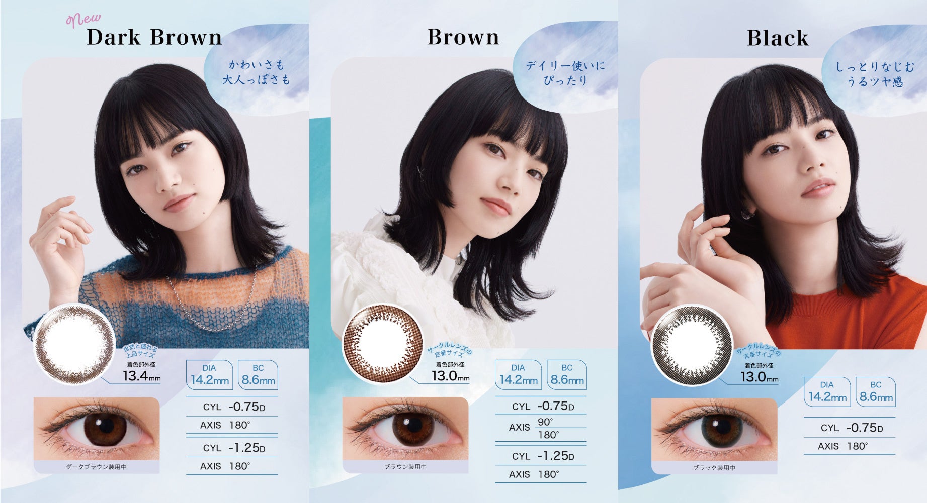 【小松菜奈イメージモデルの乱視用カラコン】に、“自然と盛れる裸眼風レンズ”新色「ダークブラウン」追加!「One day Aire REAL UV Toric(ワンデーアイレ リアルUV トーリック)」