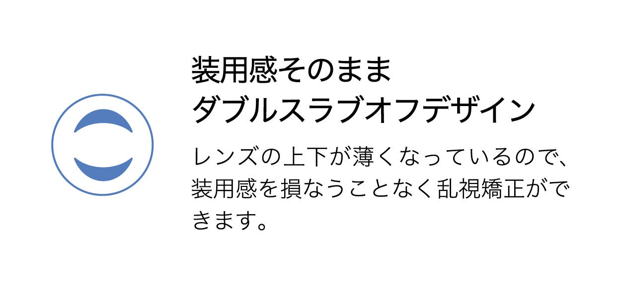 ・装用感そのままダブルスラブオフデザイン:レンズの上下が薄くなっているので、装用感を損なうことなく乱視矯正ができます。